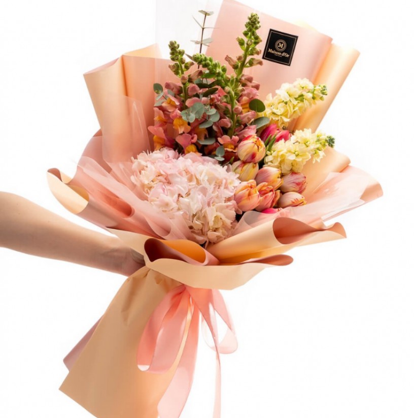 Selecţie de flori în nuanţe pastelate, asortate cu hârtie imperială.